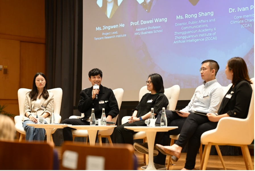 (右起)香港大學賽馬會環球企業可持續發展研究所主任余碧姸女士;氣候變化人工智能 (CCAI) 核心成員Ivan Poon博士;北京中關村學院X中關村AI研究院公共關係部部長商容女士;香港大學經管學院助理教授王大維教授;騰訊研究院項目負責人何婧文女士參與題為「人工智能與可持續發展」的圓桌對話