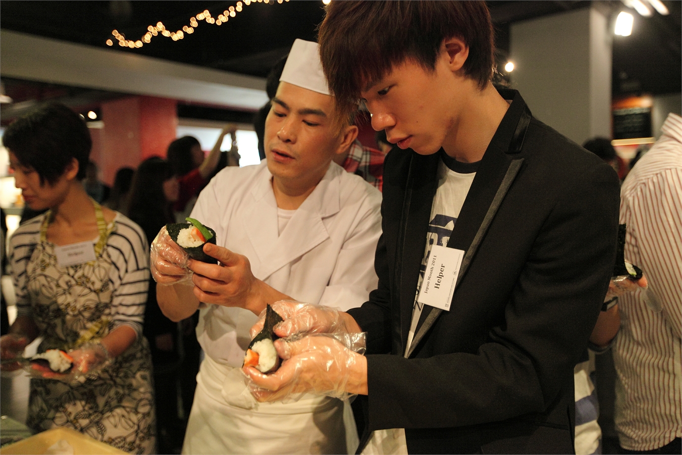 香港大學《日本月2011》今天(4月7日)在港大國際交流中心(Global Lounge)舉行的日本美食工作坊揭開序幕,日本總領事公邸主廚實川佳裕先生在港大校園炮製他譽滿全城的日本菜。參與日本美食工作坊的同學在實川佳裕先生的指導下,做出個人特色手卷壽司。