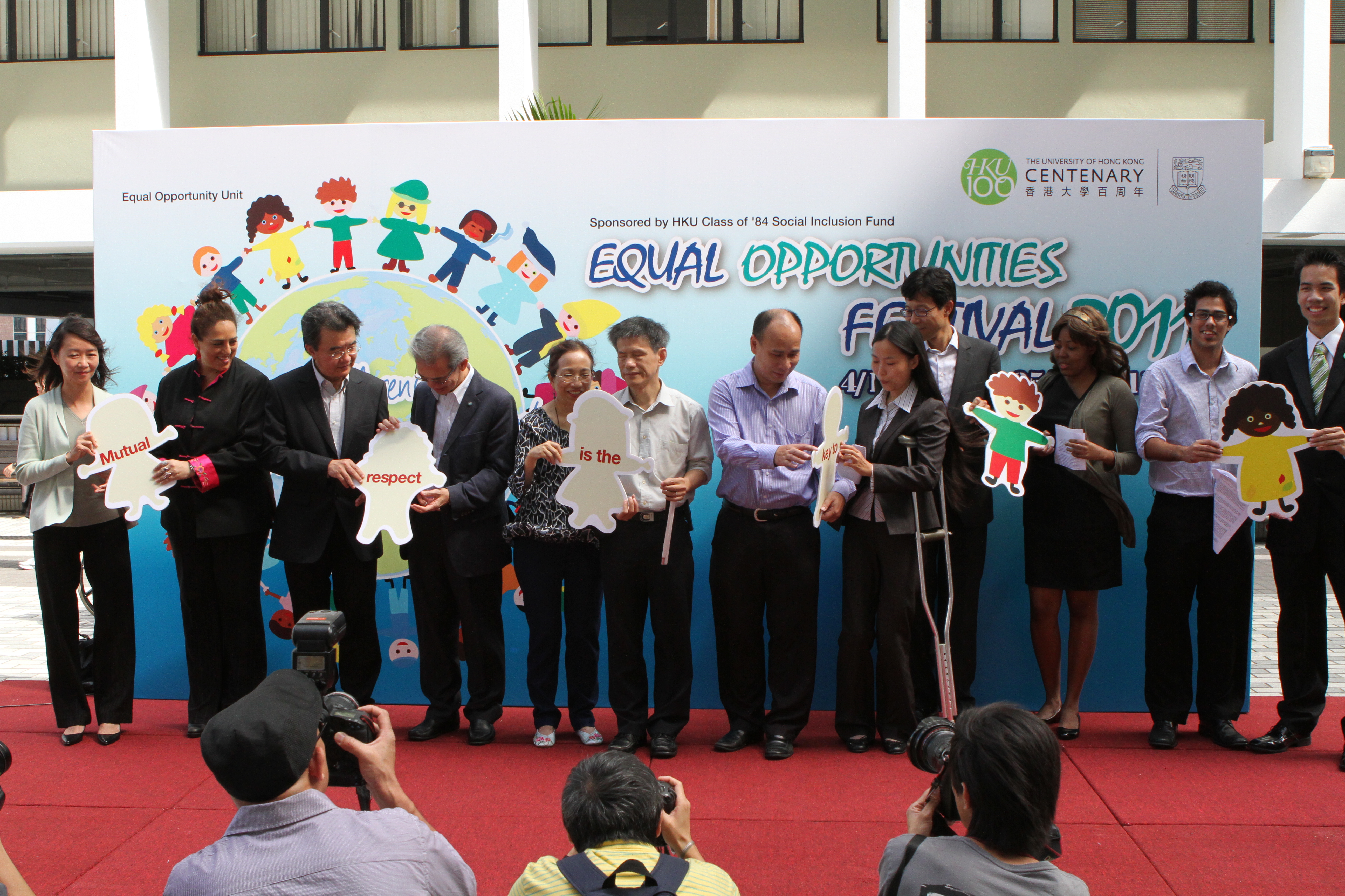 開幕典禮由平等機會委員會主席林煥光先生及港大首席副校長錢大康教授主禮。來自不同地方包括非洲及印尼的學生代表介紹他們的文化特色,並分享他們與師生共融相處的心得。需要使用拐杖輔助步行,來自內地的研究生何雨珈呼籲殘疾人士不要害怕說出他們的心聲及尋求協助。她同時強調在得到別人的幫助及關懷後「要記緊回饋社會,因為其他人亦應享有平等的學習機會。」來自美國有讀寫障礙的同學Roy Chan表示「殘疾人士希望別人對待他們如普通人一樣。無論他們屬於任何種族、性別或有任何殘疾,都應以禮相待。」