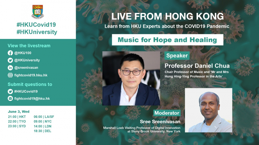 You are invited to join us online for "Live with Professor Daniel Chua", Chair Professor of Music at The University of Hong Kong. He will share his insights on "Music for Hope and Healing" in regard to the COVID-19 pandemic and take your questions from around the world.