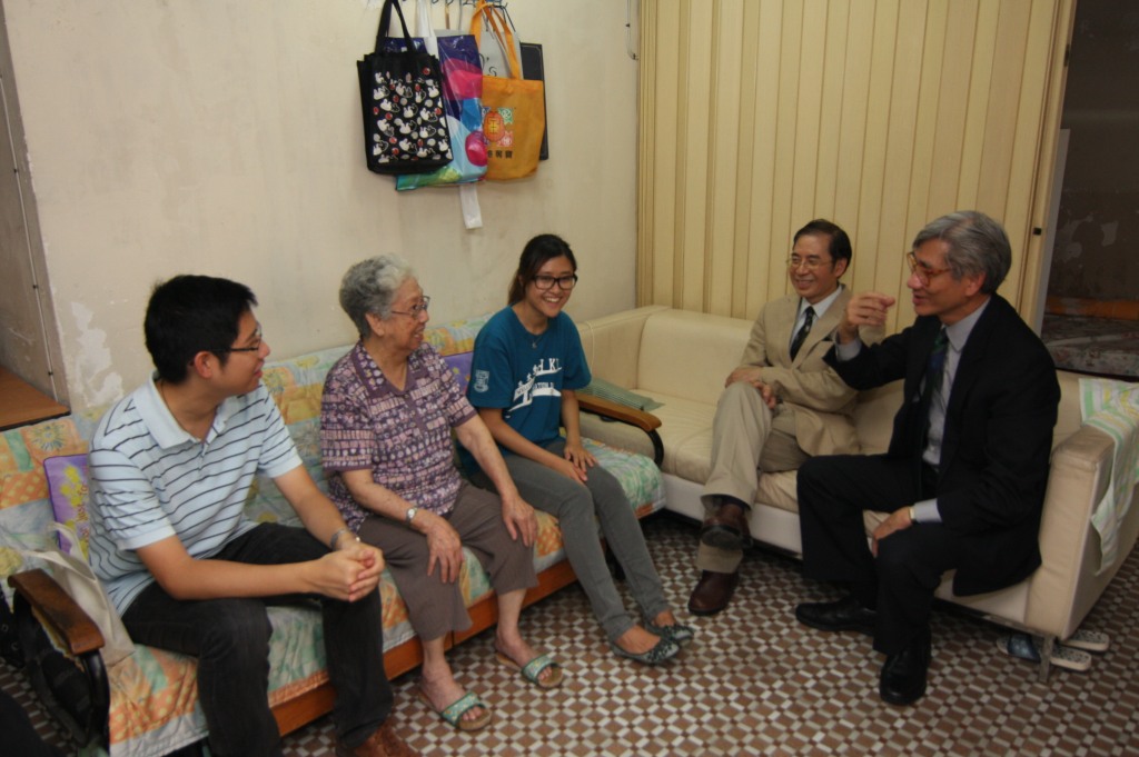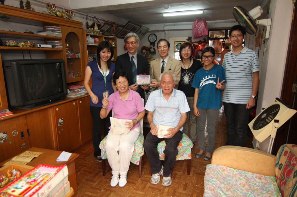 今日,香港大學副校長周肇平、香港大學校友會主席謝錫恩和兩位學生:王凱琦 (工商管理學學士〔法學〕三年級)和譚國桁(理學士〔測量學〕三年級),在耆康會荃灣長者地區中心的義工安排下,探訪獨居長者,並送上月餅和心意包。周教授本身為醫生,曾參與許多義工服務,最近就與無國界醫生到海地參與地震後醫療義工服務,他分享道:「做義工很有意義,這次能夠和長者分享中秋節的喜悅,令我感到十分高興。每次做義工的經驗都有所不同,但每當我看到人們的笑臉,就覺得看到希望。」